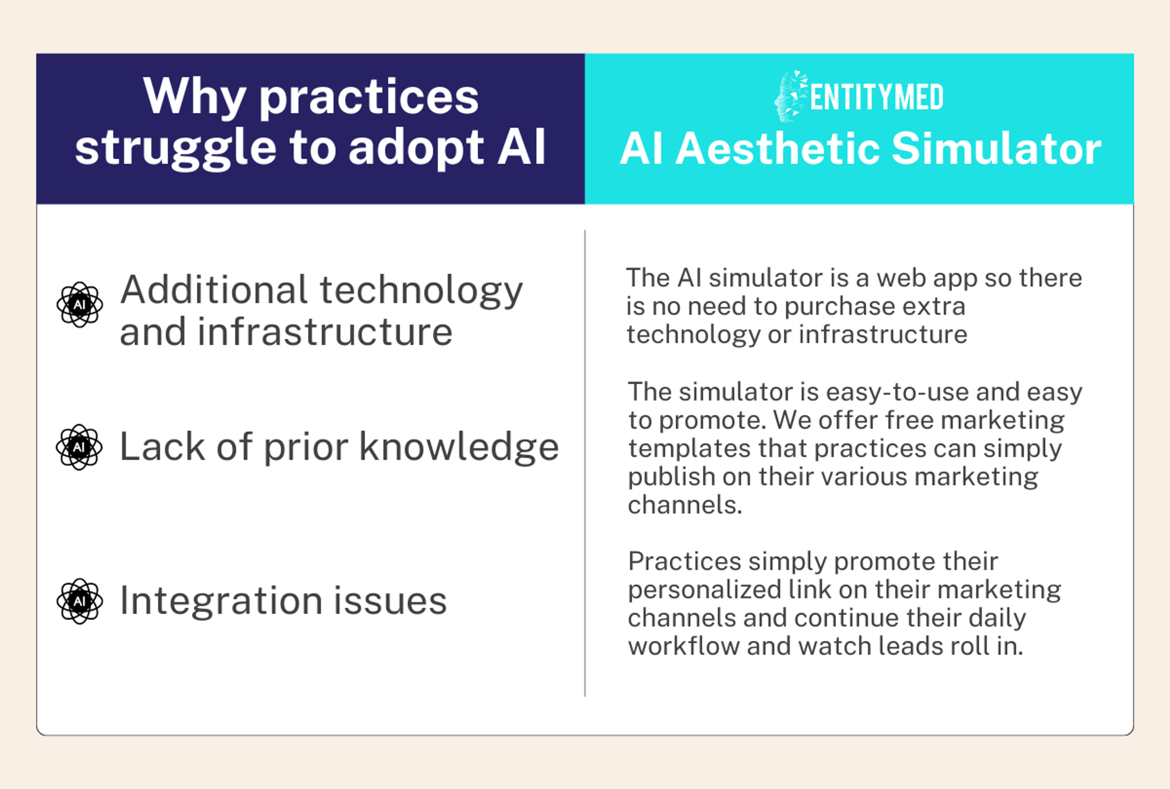 Why do practices struggle to adopt AI, and how can EntityMed’s AI Aesthetic Simulator overcome these challenges?