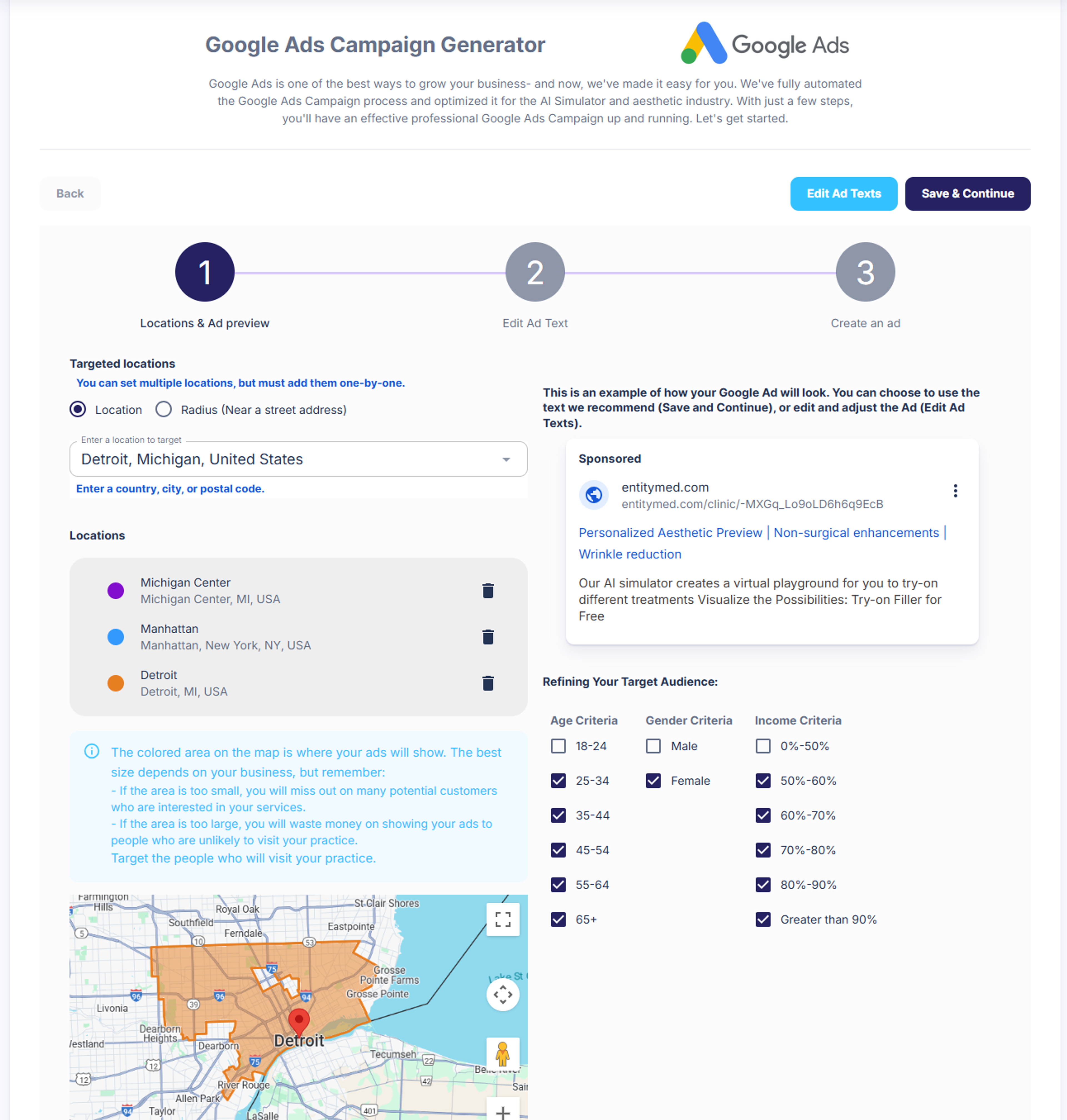Creating a Google Ad can be intimidating—keywords, bidding strategies, targeting... it’s a lot. That’s why EntityMed built a seamless, beginner-friendly interface that lets you get an ad up and running in just a few simple steps. No guesswork, no complicated dashboards—just results-driven advertising, simplified for aesthetic professionals.